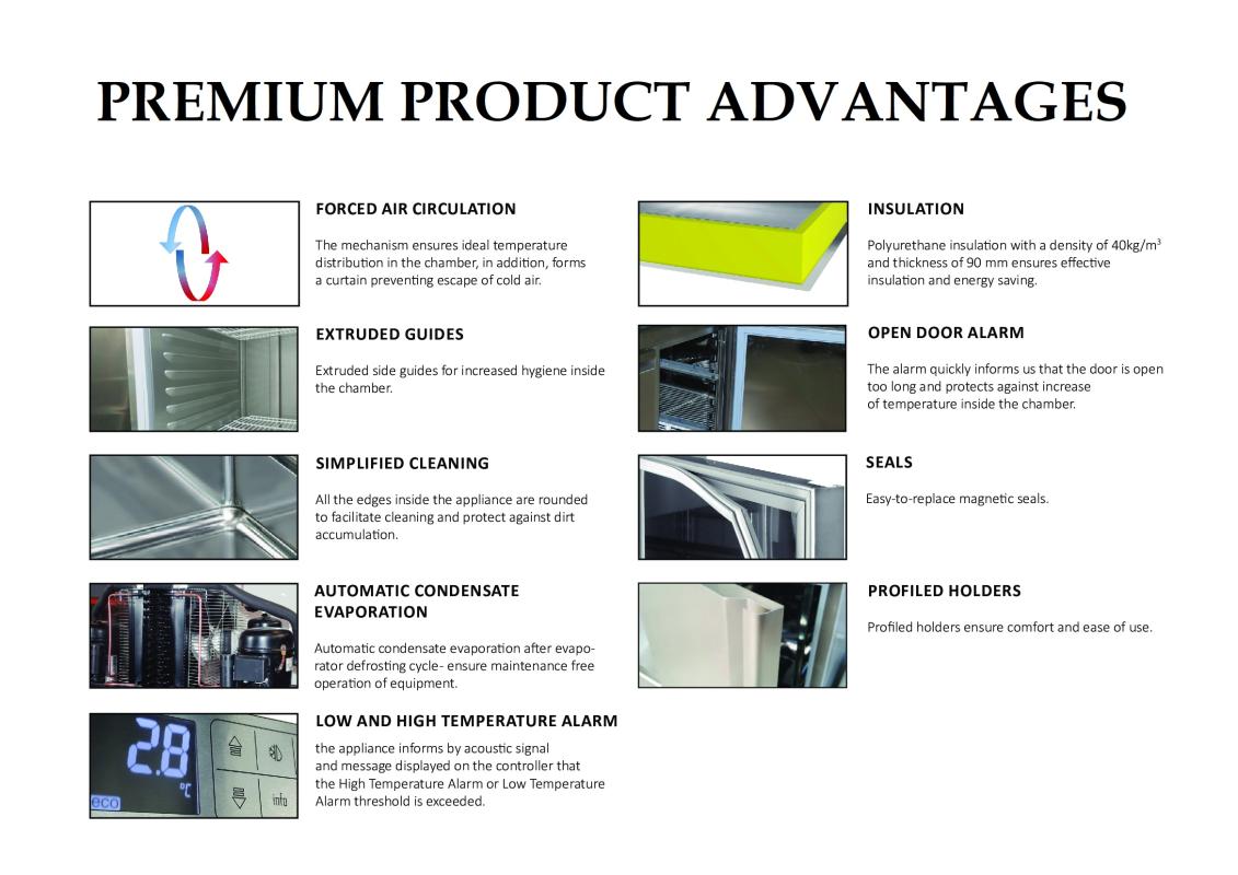 - wymuszony obieg powietrza - mechanizm gwarantuje podtrzymanie temperatury wcześniej schłodzonych produktów. Dodatkowo tworzy kurtynę, zapobiegając wydostawaniu się zimnego powietrza oraz zapewnia idealny rozkład temperatur w komorze