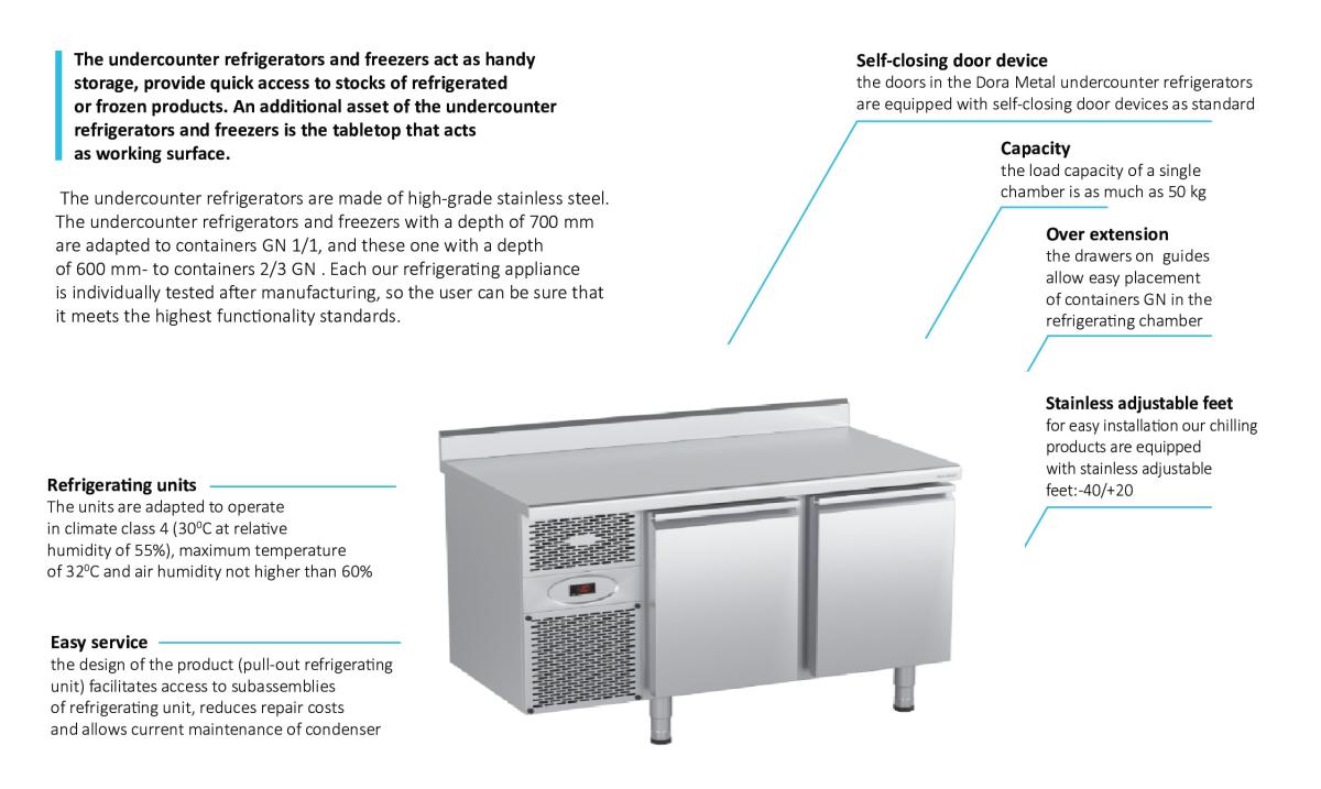 The undercounter refrigerators are made of high-grade stainless steel. The undercounter refrigerators and freezers with a depth of 700 mm are adapted to containers GN 1/1, and these one with a depth of 600 mm - to containers 2/3 GN . Each our refrigerating appliance is individually tested after manufacturing, so the user can be sure that it meets the highest functionality standards.
