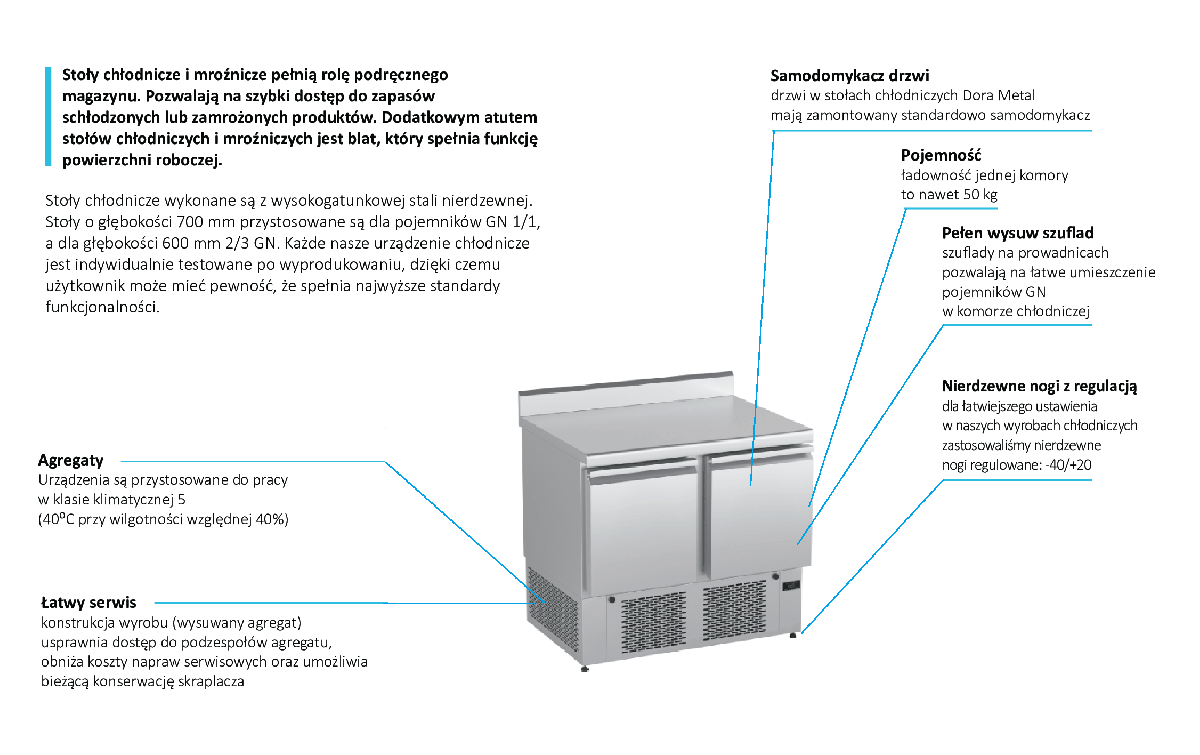 Stoły chłodnicze Dora Metal wykonane są z wysokogatunkowej stali nierdzewnej. Stoły o głębokości 700mm przystosowane są dla pojemników GN 1/1, a dla głębokości 600mm 2/3 GN. Każde nasze urządzenie chłodnicze jest indywidualnie testowane po wyprodukowaniu, dzięki czemu użytkownik może mieć pewność, że spełnia najwyższe standardy funkcjonalności.