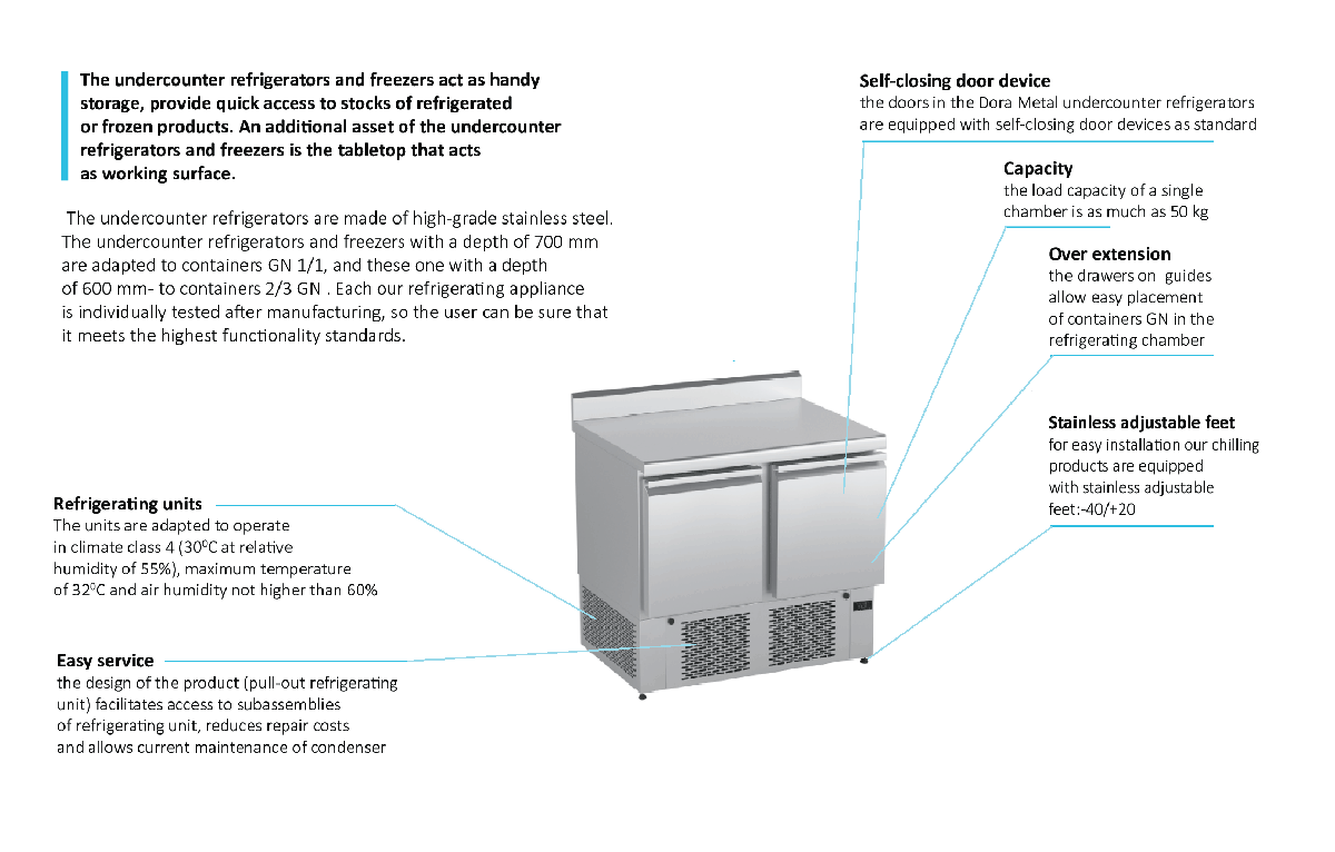 The undercounter refrigerators are made of high-grade stainless steel. The undercounter refrigerators and freezers with a depth of 700 mm are adapted to containers GN 1/1, and these one with a depth of 600 mm - to containers 2/3 GN . Each our refrigerating appliance is individually tested after manufacturing, so the user can be sure that it meets the highest functionality standards.