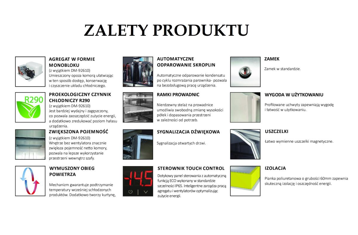 - wymuszony obieg powietrza - mechanizm gwarantuje podtrzymanie temperatury wcześniej schłodzonych produktów. Dodatkowo tworzy kurtynę, zapobiegając wydostawaniu się zimnego powietrza oraz zapewnia idealny rozkład temperatur w komorze